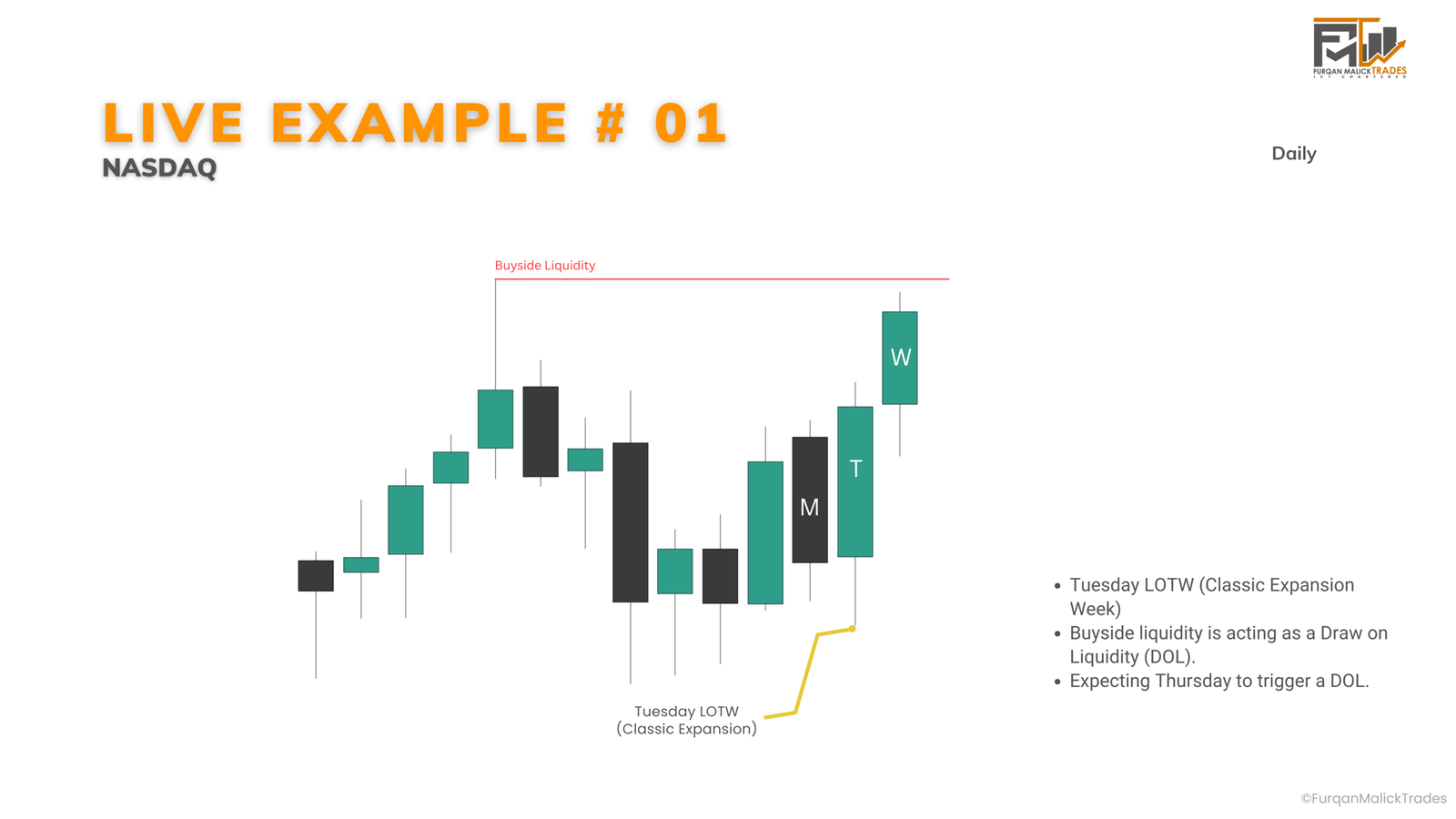 – Tuesday → Low of the Week forms (Classic expansion weekly profile means if LOTW/HOTW forms on Monday / Tuesday, Price is likely to expand till Thursday)